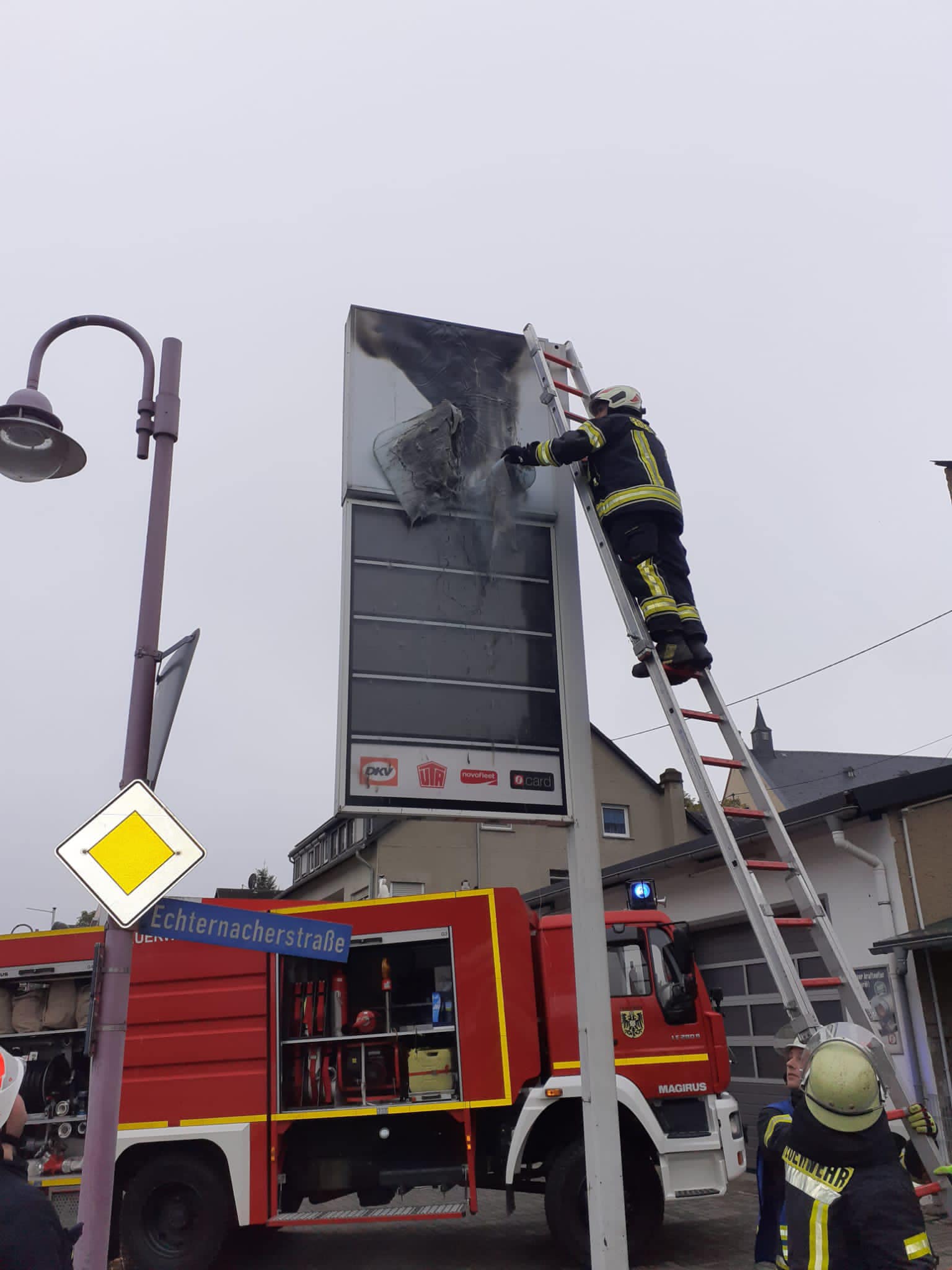 Zu einer brennenden Preisanzeige einer Tankstelle wurden die Wehren nach Kröv alarmiert. Vor Ort stellte sich heraus, dass die Anzeige schon durch Anwohner mit einem Feuerlöscher abgelöscht werden konnte. Durch die Feuerwehr wurde die Tafel mit einer Wärmebildkamera kontrolliert und letzte Glutnester wurden abgelöscht.