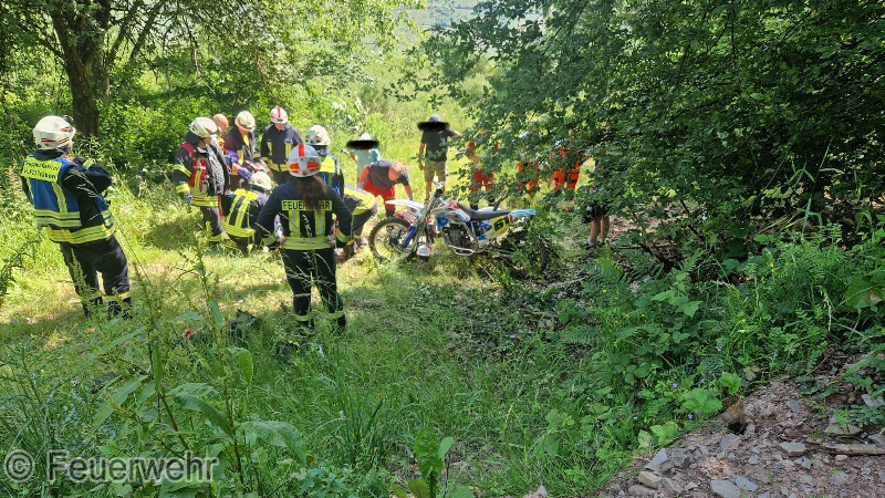 Zu einer Unterstützung für den Rettungsdienst im Gelände wurden die Wehren nach Reil auf die Motor Cross Strecke alarmiert. Hier verunfallte ein Motorrad mit Beiwagen. Der Fahrer und der Beifahrer stürzten in unwegsames Gelände und mussten durch die Feuerwehr mittels Schleifkorbtrage und geländegängigem Fahrzeug gerettet werden. Anschließend wurden die beiden dem Rettungsdienst zur weiteren Behandlung übergeben.