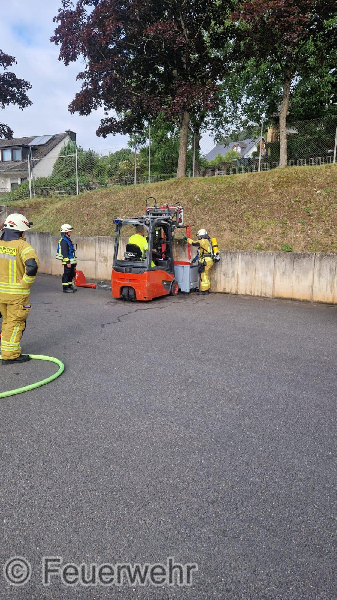 In einem Gewerbebetrieb kam es zu einem Batteriebrand eines Gabelstaplers. Bei Ankunft der Feuerwehr befand sich die Batterie schon außerhalb des Gebäudes. Durch die Feuerwehr wurde die Batterie abgelöscht und in eine Box verbracht. Anschließend wurde das Gebäude mittels Lüfter freigeblasen.