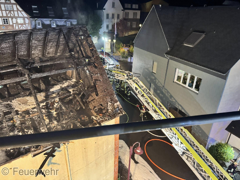 Zu einem gemeldeten Wohnungsbrand mit Menschenrettung wurden die Wehren in die Ortslage Kröv alarmiert. Vor Ort konnte eine Scheune vorgefunden werden, die sich bereits im Vollbrand befand und das sich das Feuer im Dachbereich auf zwei weitere Wohnhäuser übergriff. Während der Erkundung stellte sich glücklicherweise heraus, dass sich keine Personen mehr in den betroffenen Gebäuden befanden. Sofort wurde damit begonnen, von außen mit mehreren Strahlrohren einen Löschangriff durchzuführen. Hier kam auch eine zweite Drehleiter zum Einsatz. Gleichzeitig wurde in einem der Dachgeschosse eines Wohnhauses mit mehreren Atemschutztrupps der Innengriff durchgeführt. Um die Wasserversorgung sicherzustellen, mussten von der Mosel aus mehrere Schlauchleitungen zur Einsatzstelle verlegt werden. Im späteren Verlauf des Einsatzes wurde die Scheune mit Schaum geflutet, um die letzten Glutnester zu ersticken. Auf Grund des Brandes mussten mehrere in der Nähe befindliche Ferienwohnungen evakuiert werden. Hier wurden 21 Personen übergangsweise in der Weinbrunnenhalle untergebracht und durch Kräfte des Deutschen Roten Kreuz und des Malteser Hilfsdienstes betreut. Diese konnten später wieder in die Wohnungen zurück kehren. Bei dem Einsatz wurden zwei Personen mit Verdacht auf Rauchgasvergiftung an den Rettungsdienst übergeben. Für die Dauer des Einsatzes musste die B53 in der Ortslage voll gesperrt werden.
