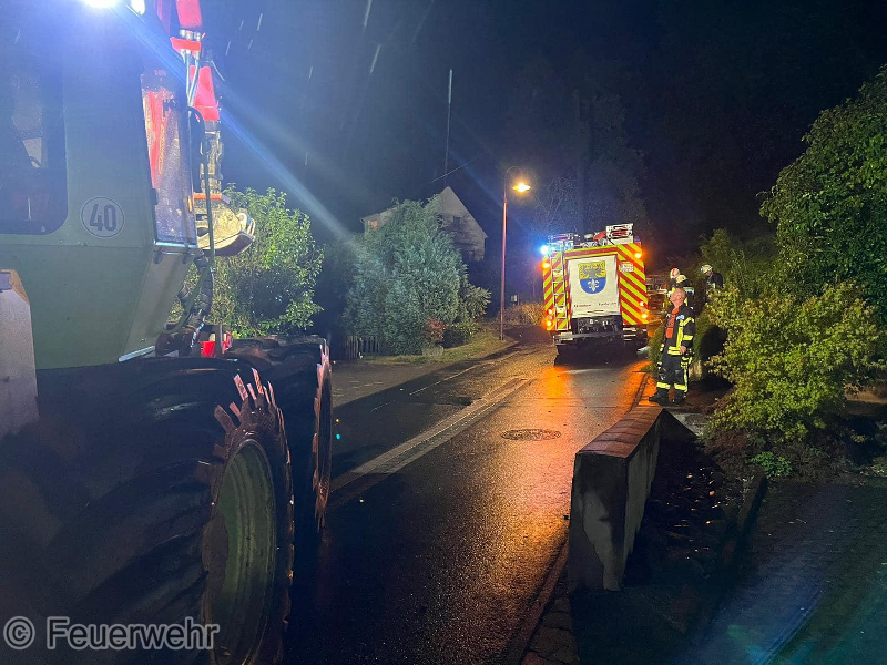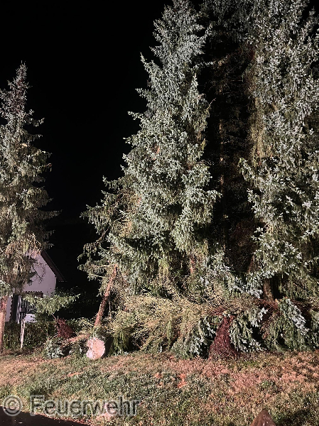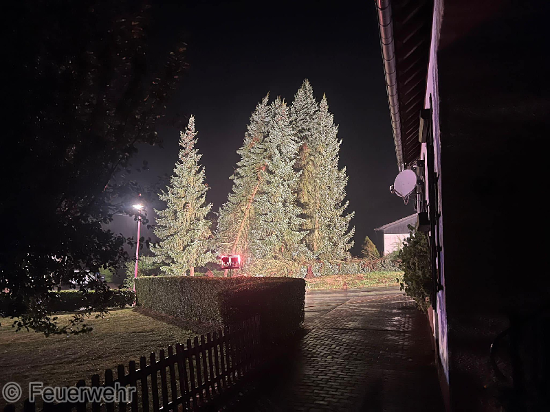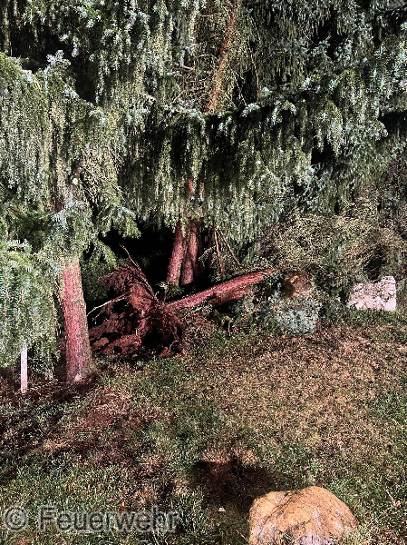 In der Ortslage Kinderbeuern stürzten auf Grund des Unwetters ein Baum knapp neben einem Haus um. Da hier mehrere Bäume auf das Haus umzustürzen zu drohten, wurde die Einsatzstelle durch die Feuerwehr abgesperrt und ausgeleuchtet. Durch ein privates Unternehmen wurden die kritischen Bäume entfernt um ein weiteres umstürzen zu verhindern. Gleichzeitig wurden in der Ortslage mehrere Äste beseitigt.