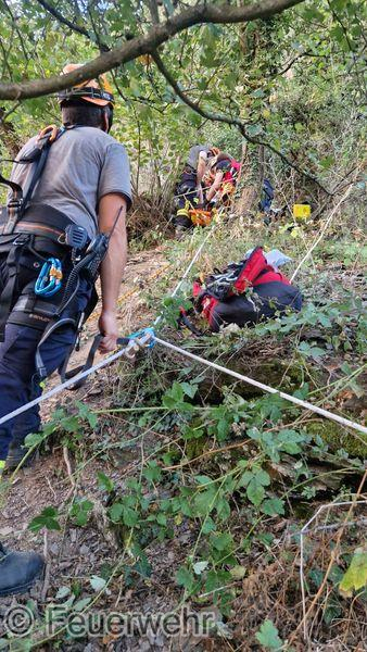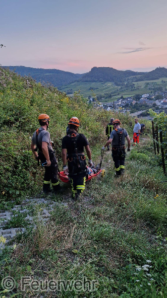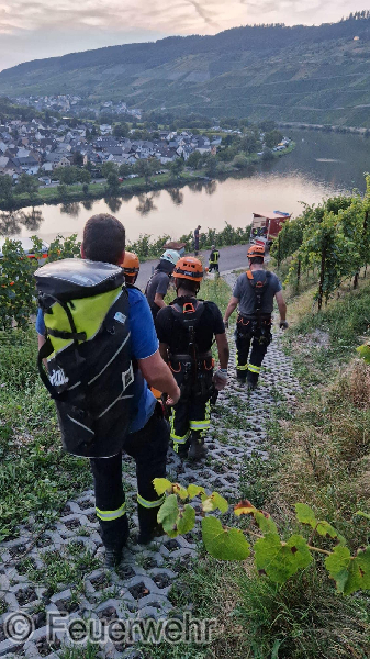 Im Bereich des Landal Green Park auf Mont-Royal stürzte ein 79 jähriger Urlauber beim Bilder machen einen steilen Abhang hinab. Nach einer aufwendigen Suchaktion und ständigem telefonischen Kontakt zur Polizei konnte er schließlich durch Feuerwehrkräfte in einem sehr steilen und felsigen Gelände, fern ab von jeglichen Wegen, ausfindig gemacht werden. Durch speziell geschultes Personal der Absturzsicherungseinheiten aus Kröv und Traben wurde der Patient zuerst medizinisch erstversorgt und anschließend in einer Schleifkorbtrage auf einen Gehweg abgeseilt.